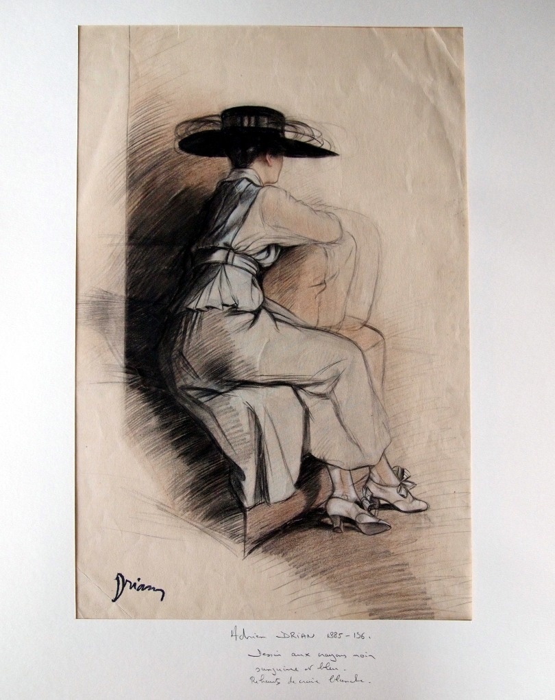 Drian, Etienne. Frauenmode (Rückansicht einer sitzenden Dame mit blauer Kleidung und schwarzem Hut). Farbkreidezeichnung (schwarz, weiß, blau, Rötel) auf chamoisfarbenem Papier. Stempelsignatur unten links. 49 x 32 cm.