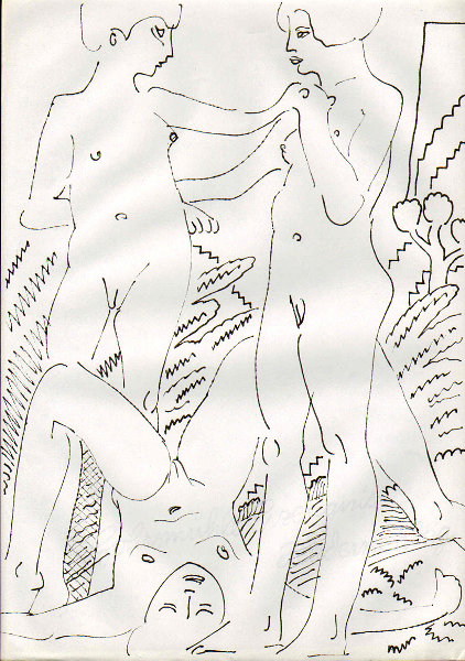 Frank, Edvard. Erotische Szene. Tuschfeder auf Papier mit Wasserzeichen „Gohrsmühle Erzeugnis Hadernhaltig“ (vor 1971). Verso Nachlass-Stempel. 29,5 x 20,8 cm.