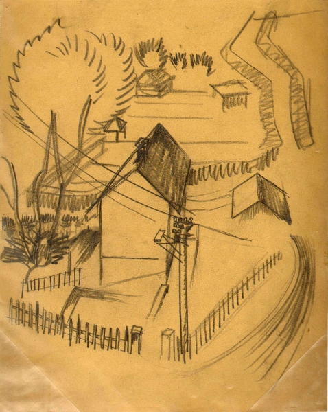 Hosp, Ralph Joseph. Stromleitung über dem Haus. Bleistift auf Zeichenpapier. Verso Nachlass-Stempel. 33 x 26,3 cm.