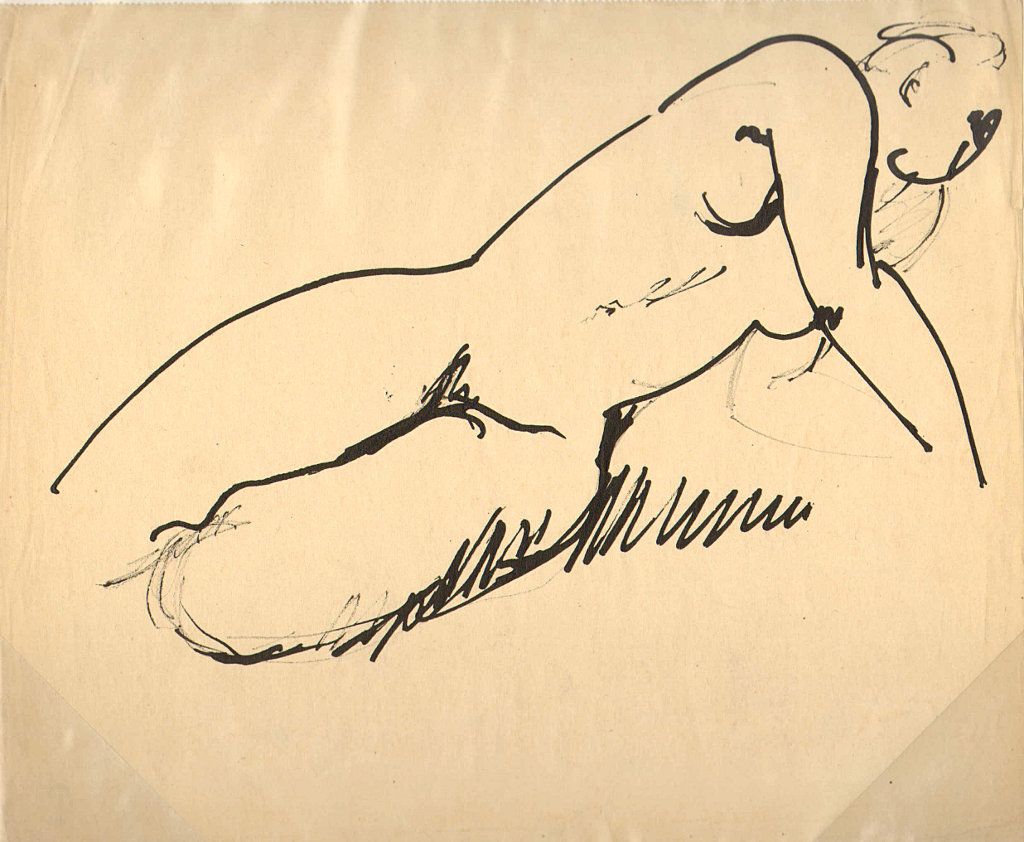 Otto, Lothar. Aktskizze. um 1930. Tusche auf chamoisfarbenem Zeichenpapier. Verso mit Stempel-Monogramm. 26 x 31,3 cm.
